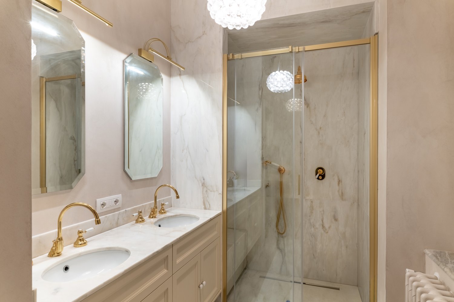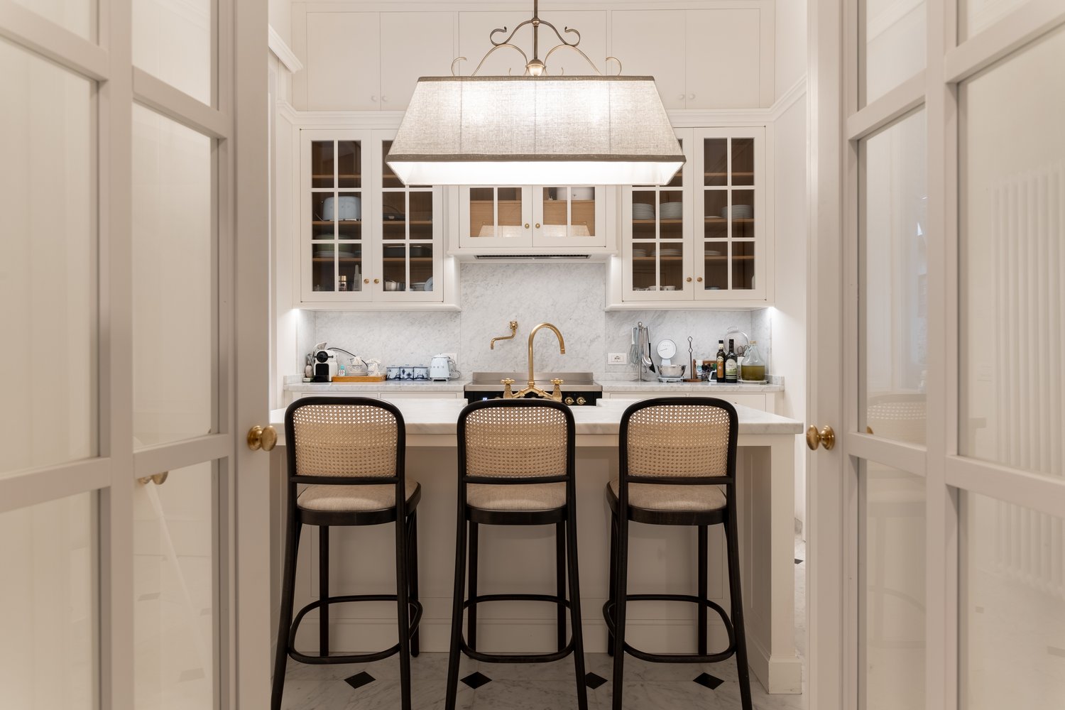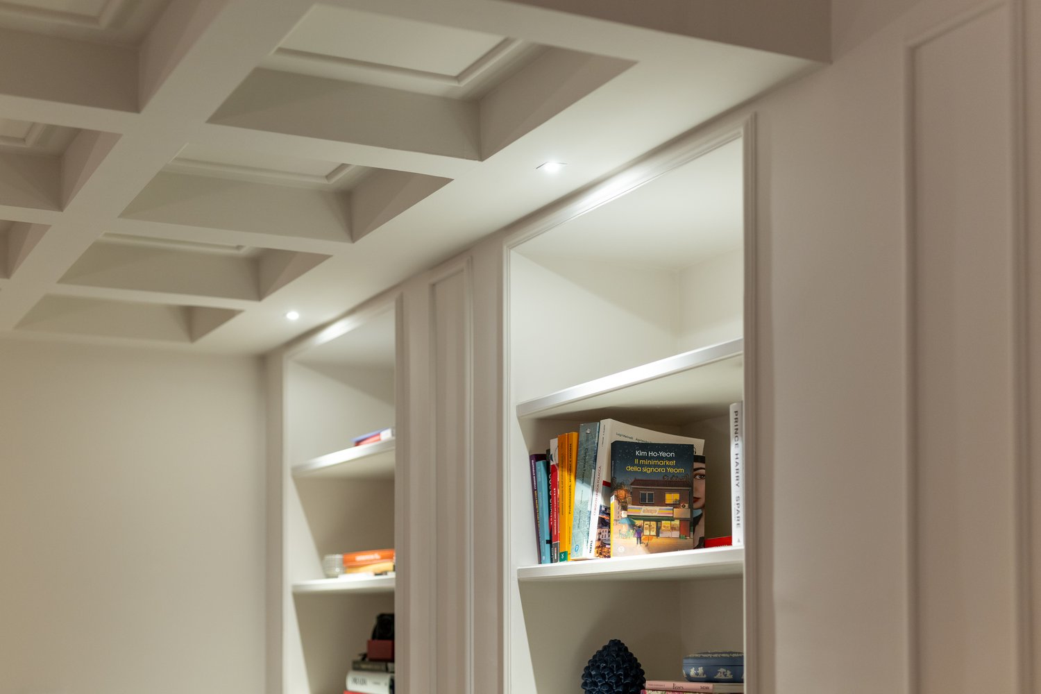I nuovi soffitti cassettonati, le boiserie delle testate dei letti, i pavimenti decorati, gli specchi bronzati, le cornici in gesso, le rasature dai toni delicati e caldi, dialogano con l’esistente e generano un nuovo equilibrio.