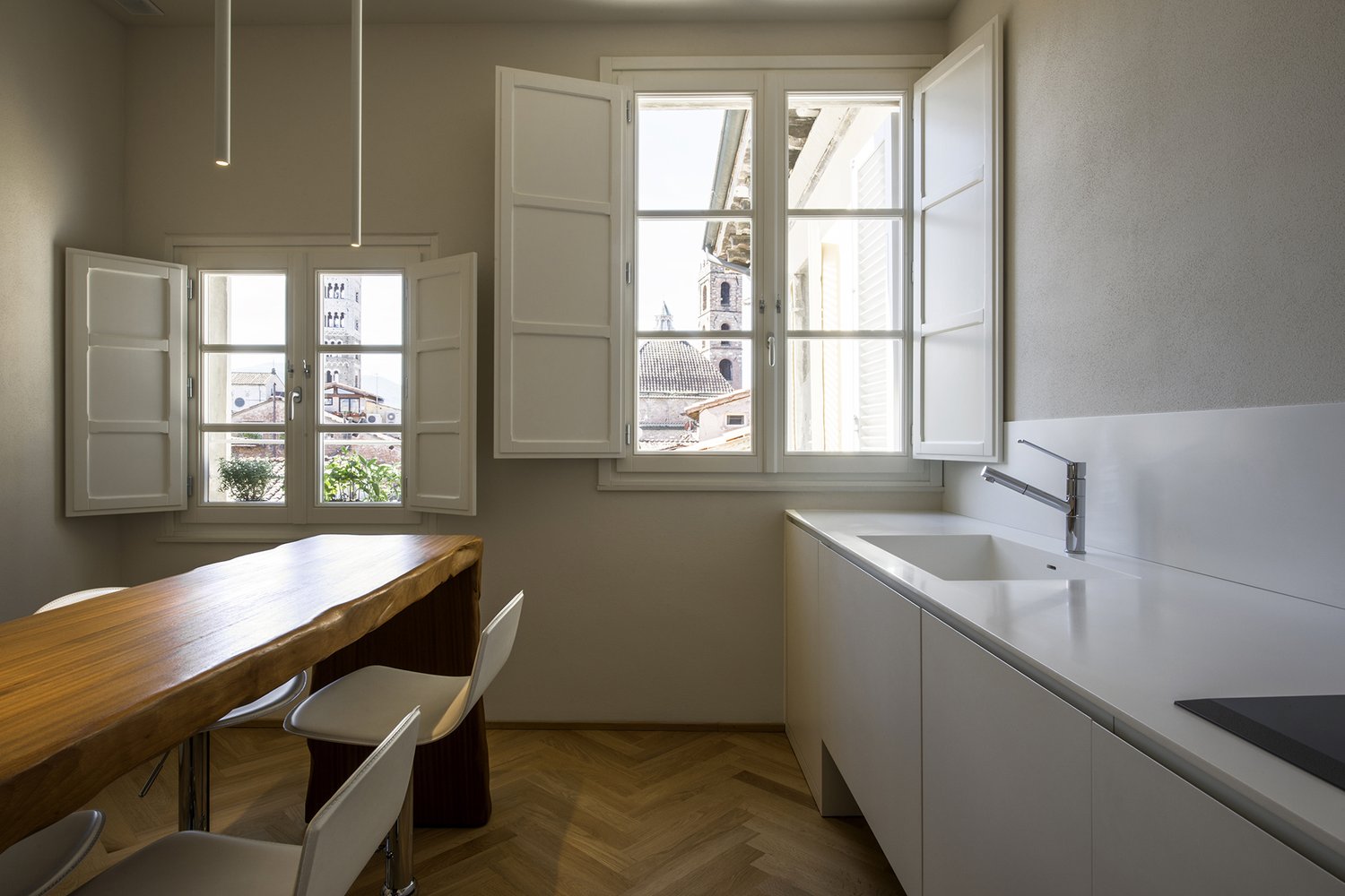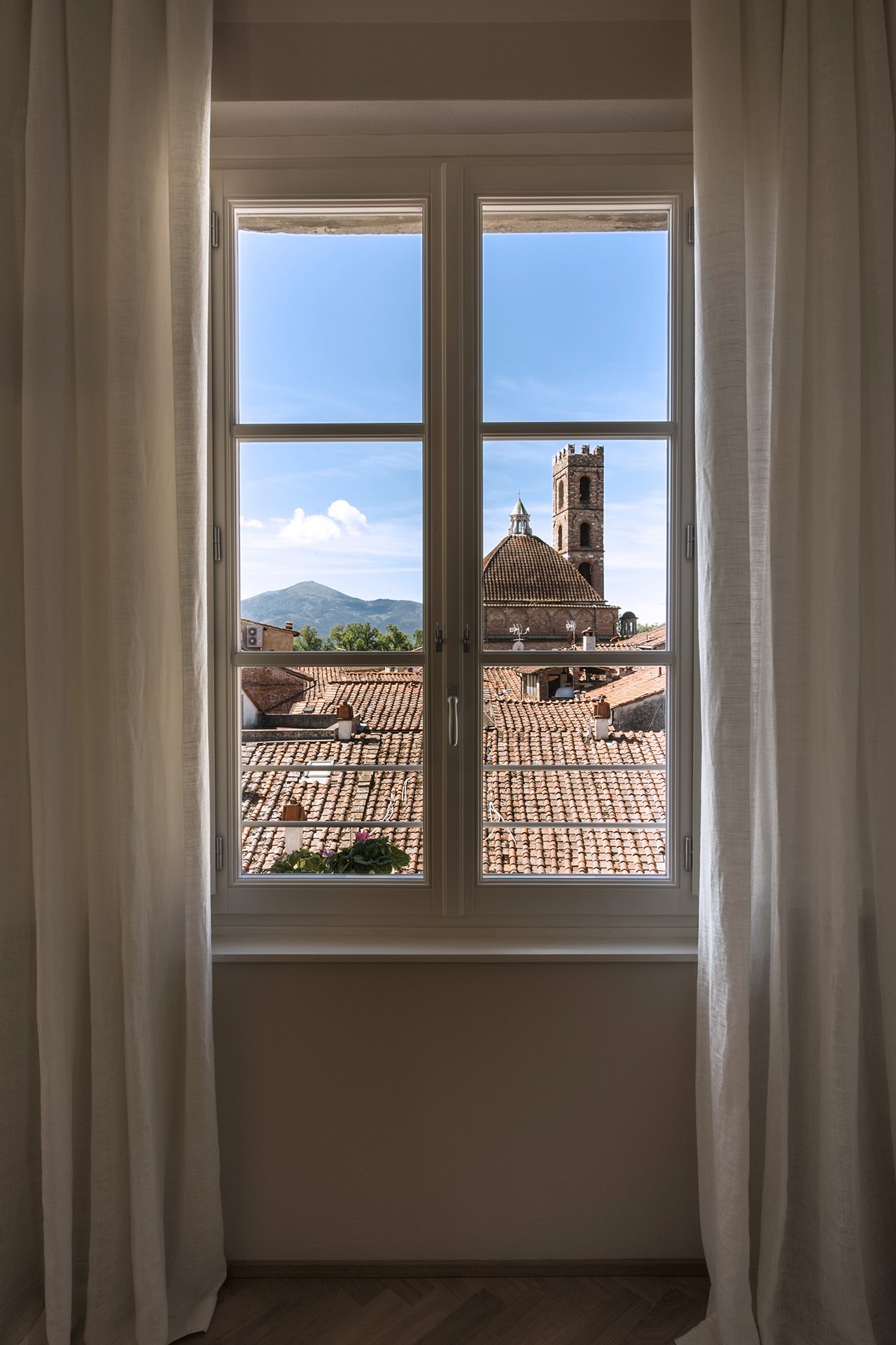 Affacciato sui tetti di Lucca, al quarto ed ultimo piano di un’importante residenza nel centro storico della città, si trova un appartamento nel quale la luce permea ogni angolo e lo sguardo è lasciato libero di correre indisturbato.